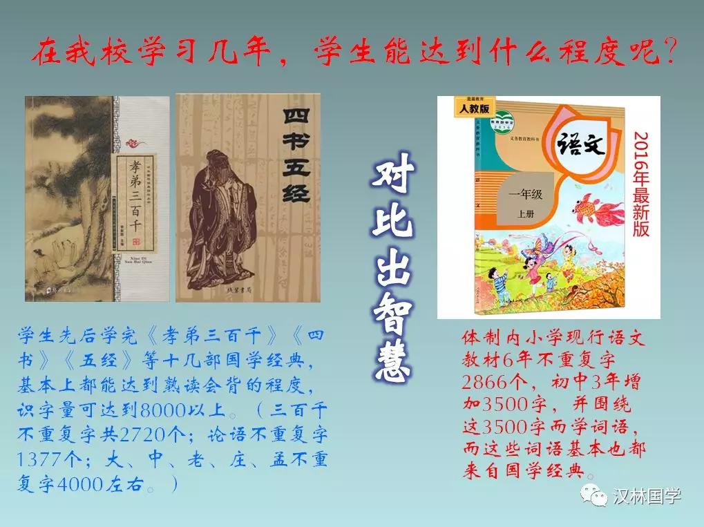 語文+經(jīng)典:經(jīng)典指“四書五經(jīng)”“諸子百家”“三百千”等(如:《論語》《孟子》《道德經(jīng)》《黃帝內(nèi)經(jīng)》《三字經(jīng)》等);現(xiàn)行教材指小學(xué)語文課本內(nèi)容。教學(xué)根據(jù)兒童時期記憶力強的特點,采用切實可行的讀經(jīng)理念和方法,使學(xué)生在無壓力的狀態(tài)下輕松讀誦經(jīng)典,直至終身不忘;在經(jīng)典讀誦的同時集中識字,提前海量閱讀;現(xiàn)行語文課,教學(xué)有老師指導(dǎo)學(xué)生廣泛閱讀,合作探究,并熟悉和適應(yīng)應(yīng)試考評方法。